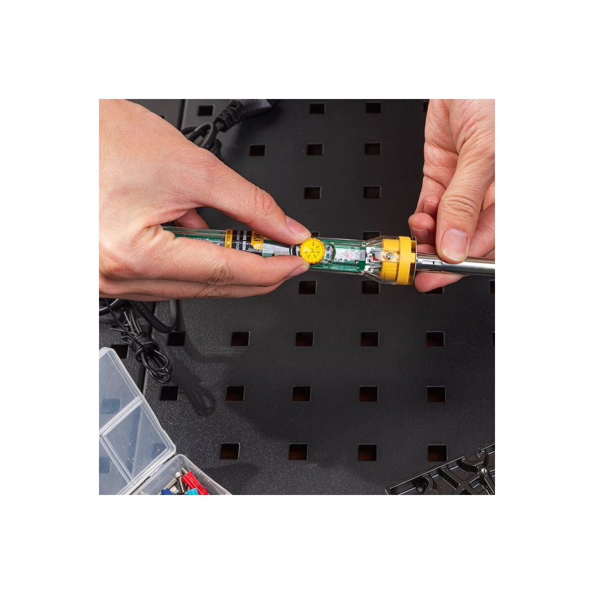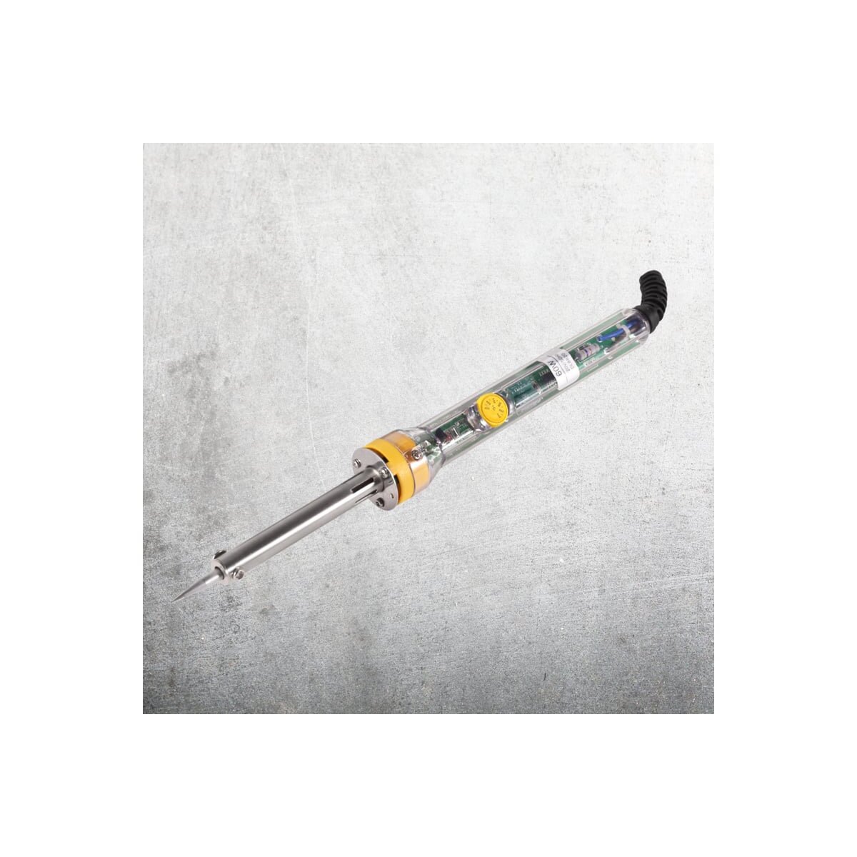 Данная модель оснащена керамическим нагревателем, за счет чего разогревается гораздо быстрее классических паяльников. Обладает колёсиком регулировки температуры, необычным прозрачным корпусом ручки и кабелем длиной 1,5 метра.
