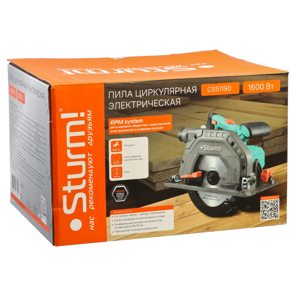 Пила циркулярная Sturm! CS51190 — маневренный и мощный электроинструмент для осуществления поперечных или продольных пропилов в заготовках из древесины, фанеры и пластмассы. Подготовка данной модели к выполнению конкретной задачи облегчена электронной регулировкой оборотов. Практичности в применение пилы вносит литая прочная платформа из алюминия, что способствует исполнению качественных резов. В свою очередь функция поддержания оборотов под нагрузкой благоприятствует продуктивной работе. Долговечности инструмента содействуют усиленная пылезащита двигателя и плавный пуск.