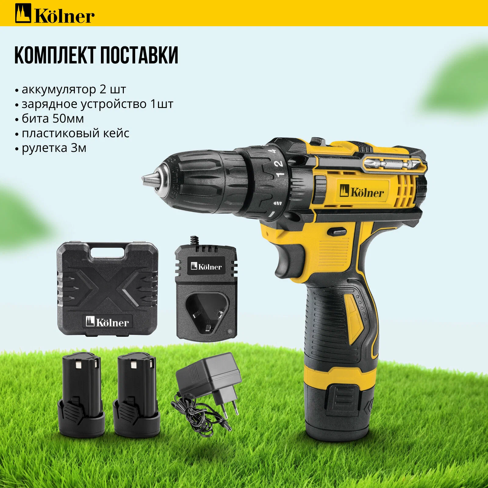 2x Аккумулятор, 1x Зарядное устройство, 1x Пластиковый кейс, 1x Набор бит