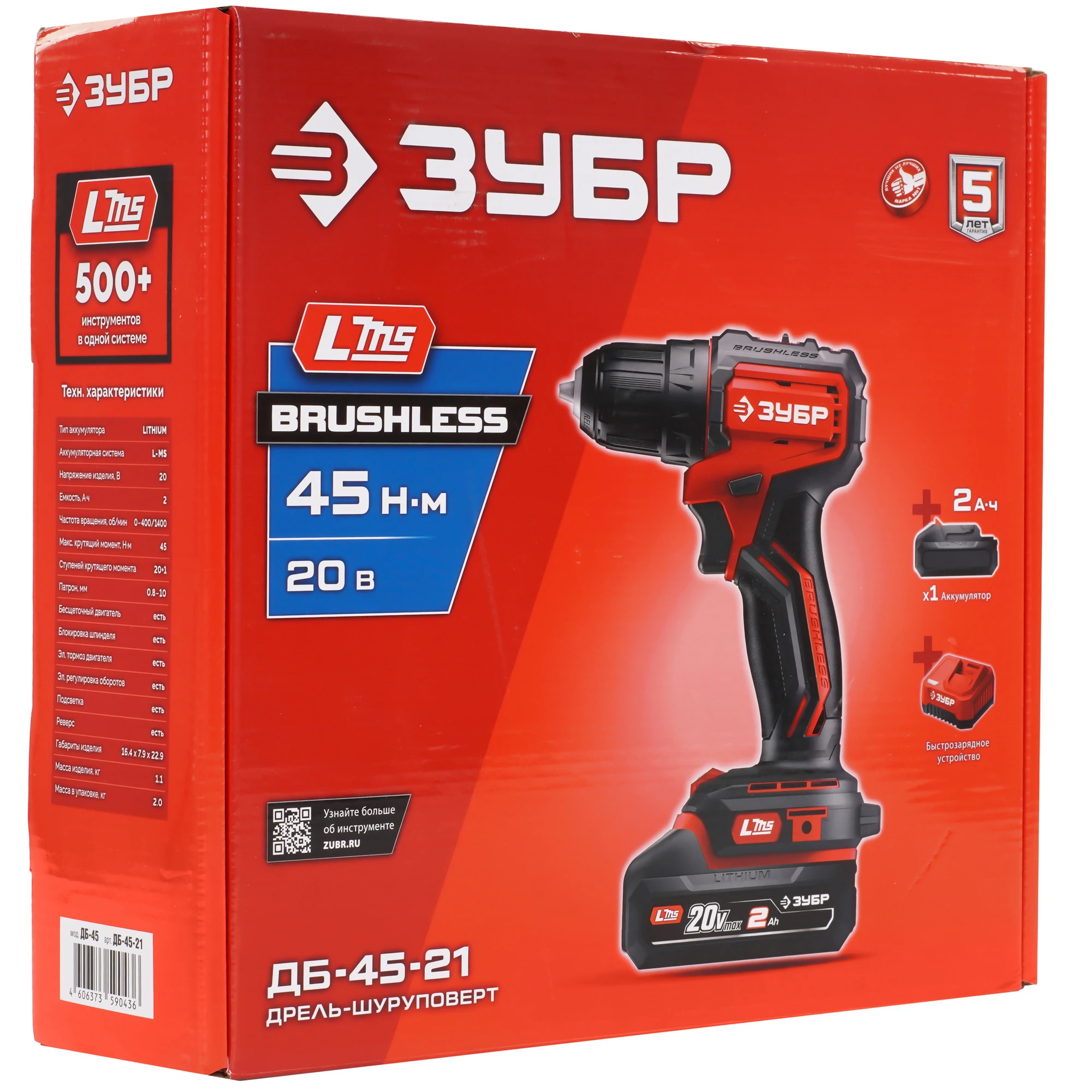 ЗУБР 20 В, 45 Н·м, 1 АКБ LMS (2 А·ч), бесщеточная дрель-шуруповерт ДБ-45-21 - инструмент из единой аккумуляторной системы LMS для 500+ инструментов.