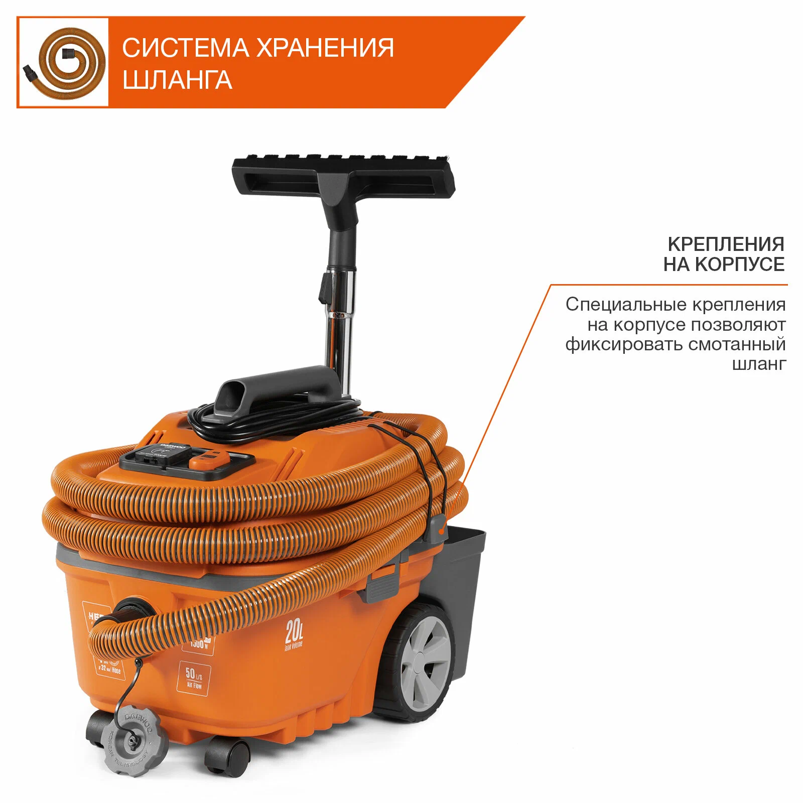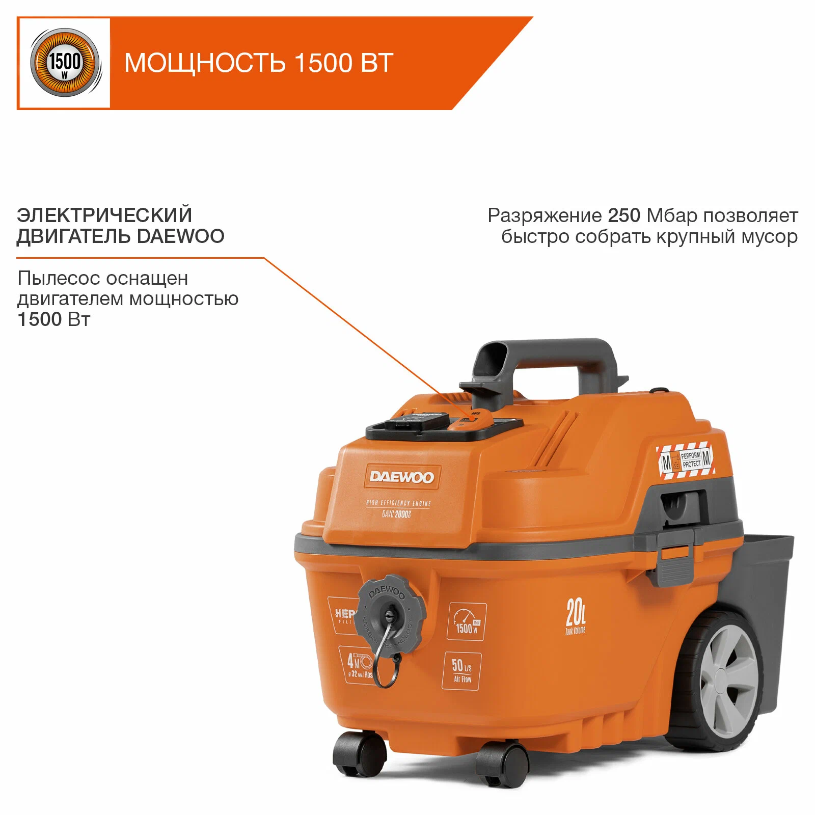 Общие характеристикиБрендDaewoo Power ProductsЦвет товараоранжевыйТиппрофессиональный пылесосТип уборкивлажная, сухаяДополнительные функцииработа на выдув, регулировка мощности, функция сбора жидкостиТруба всасываниятелескопическаяКомплектациянасадка для пола, пылесборник-пакет, трубка удлинительная, шланг, щелевая насадкаТип пылесборникаконтейнер, мешокОбъем бака/пылесборника20 лТруба всасываниятелескопическаяМощность1500 ВтРасход воздуха3000 л/сВстроенная розеткаестьДлина шланга4 мДлина кабеля5 мКласс пылиMРазрежение250 мБарСистема очистки фильтраручнаяВес1.5 кгДополнительная информацияКорзина для аксессуаров