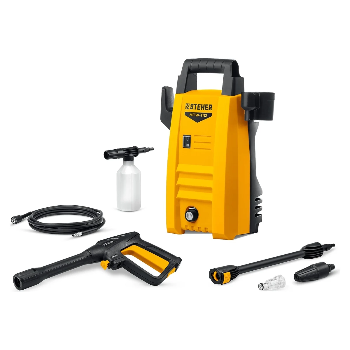 Мойка высокого давления STEHER HPW-110 предназначена для образования струи воды высокого давления, используемой для мойки автомобилей, велосипедов и другой колесной техники, садового инвентаря, наружных стен и уличных покрытий.