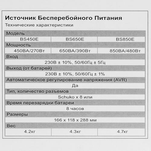 ИБП CyberPower BS650Е NEW отлично справляется с возложенными на него функциями по защите подключенных приборов от перегрузки, высоковольтных импульсов, а также поддержке их в рабочем состоянии сразу же после экстренного отключения электричества. К ИБП можно одновременно подключать до 8 различных единиц техники. Для этого в его конструкции предусмотрены евророзетки, а также интерфейс USB. Визуальный контроль состояния ИБП обеспечивают светодиодные индикаторы на его корпусе.