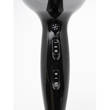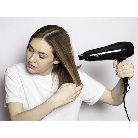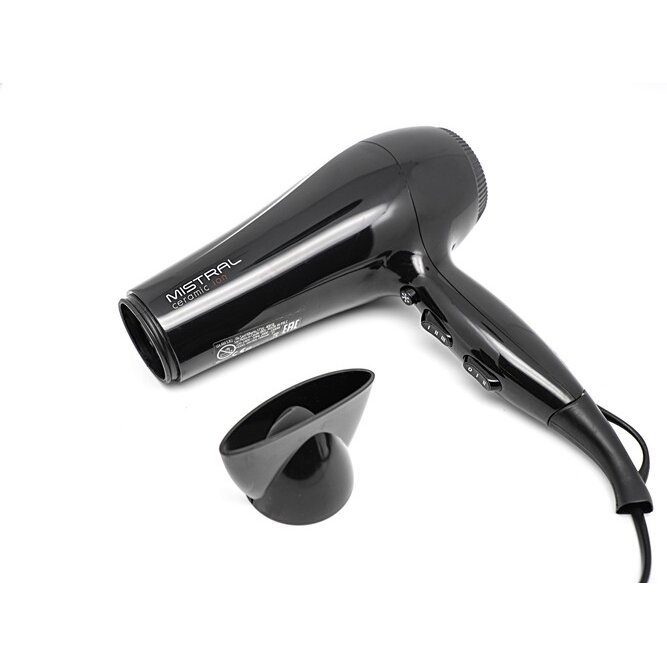 Легкий фен для волос Mistral Ceramic Ion с мощностью 2200 Вт и DC мотором выполнен в классическом черном цвете. Кнопки управления расположены на рукоятке, фен удобно лежит в руке, имеет небольшой вес всего 405 грамм. У него 6 режимов работы: 3 температуры и 2 скорости, а также функция холодного обдува, которая помогает закрепить укладку. В комплект входит одна насадка-концентратор шириной 8 см для сушки и укладки на брашинг.