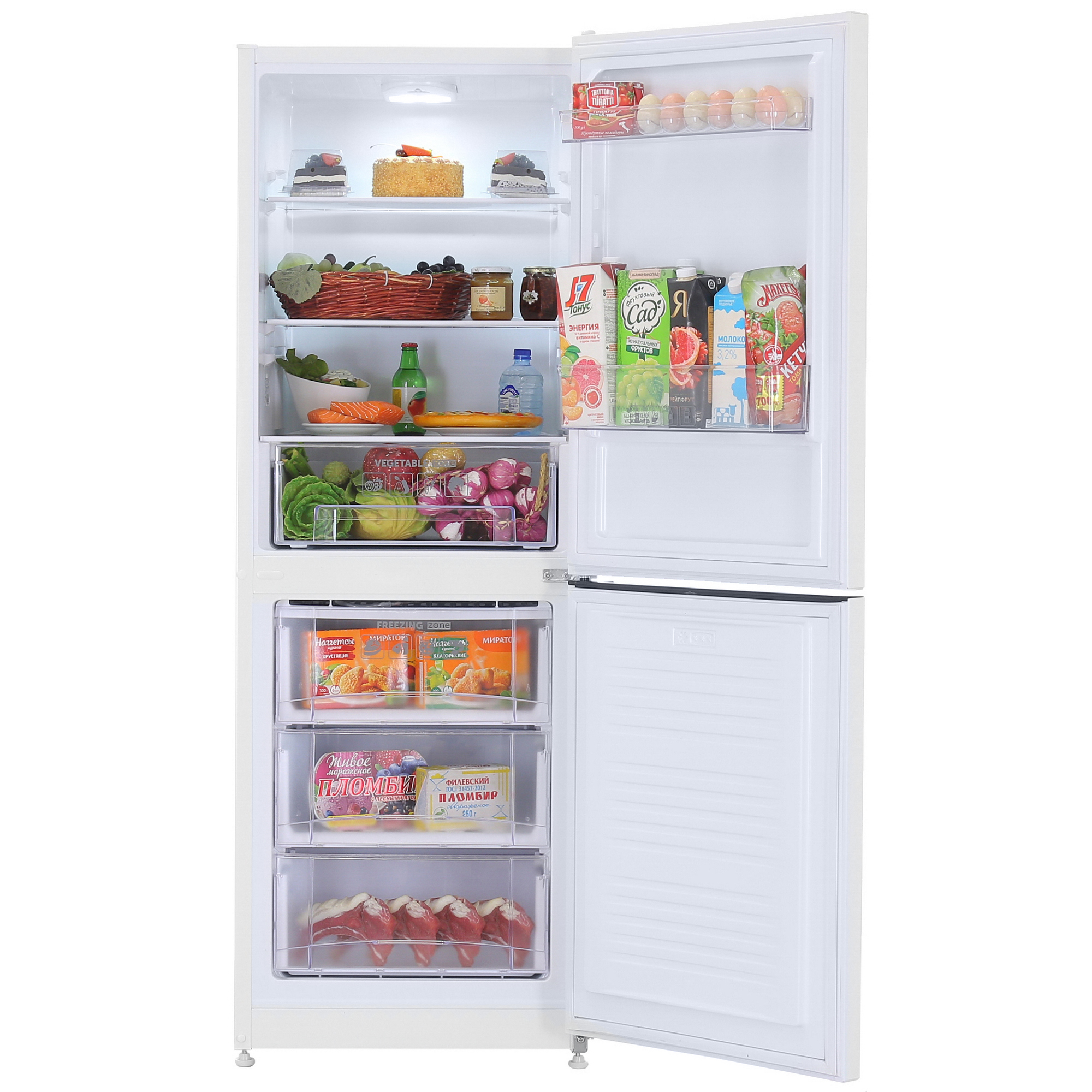 В холодильной камере расположены 3 полки и 1 ящик. На дверце - 2 полки. В морозильной камере вы найдете 3 ящика для удобного хранения замороженных продуктов. Есть подставка для яиц и форма для льда.