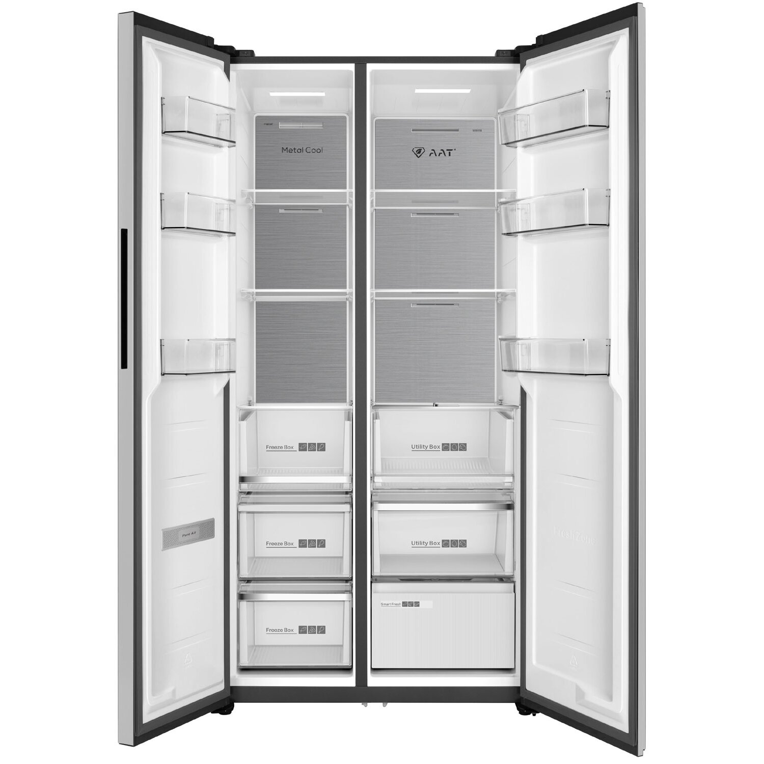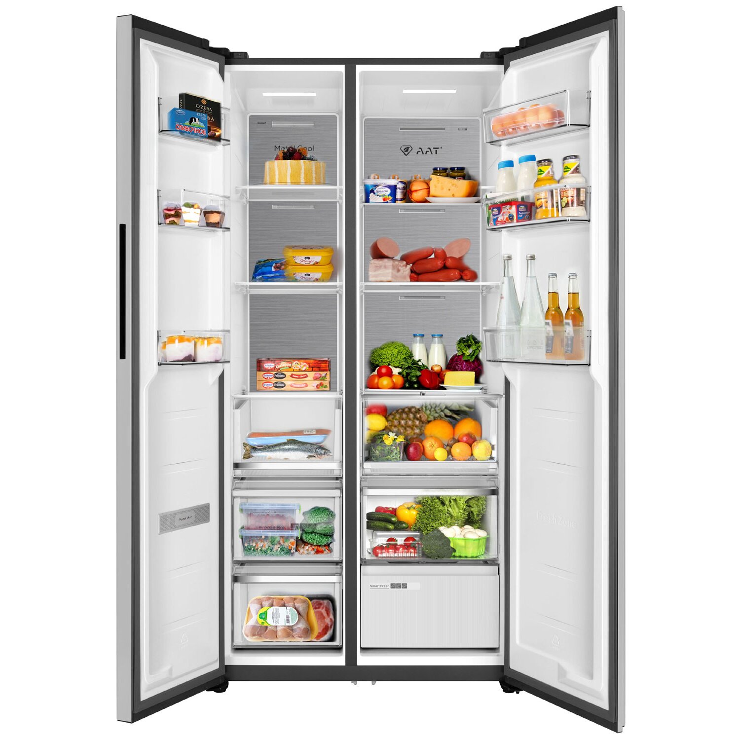 Полки и ящики со стальным обрамлением, Зона свежести Smart Fresh с регулировкой температуры от -3 до 4°С, Регулятор уровня влажности Humidity Control в выдвижном ящике, Предупреждение о повышении температуры в морозильной камере, Особая конструкция и теплоотвод позволяют встроить прибор в нишу