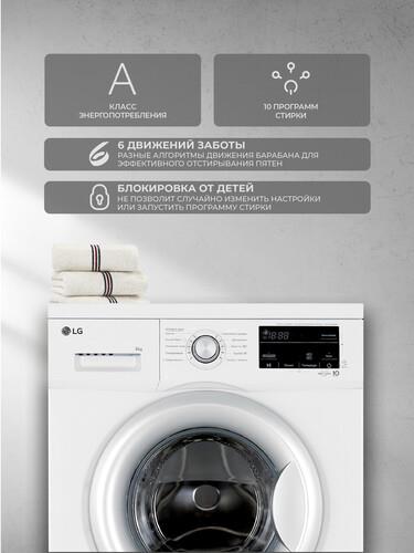 LG F2J3NS1W оснащена режимами мобильной диагностики Smart Diagnosis, обработки паром и очистки барабана. Технология «6 движений заботы» гарантирует эффективную и деликатную стирку. Система автовзвешивания экономит воду/электричество при неполной загрузке барабана, автобаланс защищает от сильных вибраций при отжиме, автоперезапуск сохраняет заданные настройки при сбое в сети.
