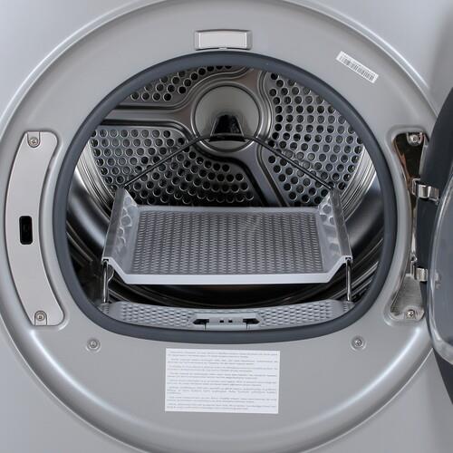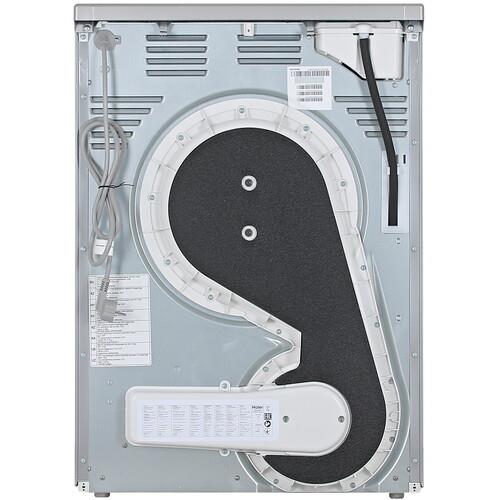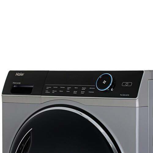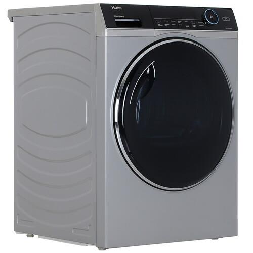 Сушильная машина Haier HD90-A2979S представлена в серебристом корпусе размерами 59.5x84.5x60 см. Она использует тепловой насос для нагрева воздуха в барабане и поддерживает конденсационную сушку. В барабан можно загрузить до 9 кг влажного белья после стирки. Благодаря теплообменнику воздух внутри барабана нагревается. Затем воздух испаряет влагу с вещей, конденсирует ее в пар и сливая в виде капель в канализацию. Такой способ сушки не требует подключения аппарата к вентиляции.