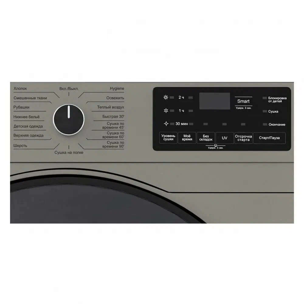 Современная сушильная машина в стильном сером исполнении, разработанная для эффективного и бережного ухода за одеждой. Модель сочетает в себе практичную функциональность и привлекательный дизайн, идеально вписывающийся в современное жилое пространство.