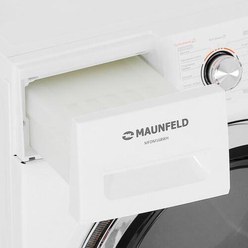Сушильная машина MAUNFELD MFDM168WH обладает широким набором режимов и функций. Это обеспечивает быстрый и эффективный результат сушки. Аппарат выполнен в белом корпусе размерами 59.5x84.5x61.5 см, использует конденсационную сушку, в основе которой лежит тепловой насос. Он нагревает воздух внутри барабана, что обеспечивает конденсацию пара и его слив в виде воды в отверстие канализации. Такой способ сушки не предусматривает подключение машины к вентиляции, что упрощает эксплуатацию модели.