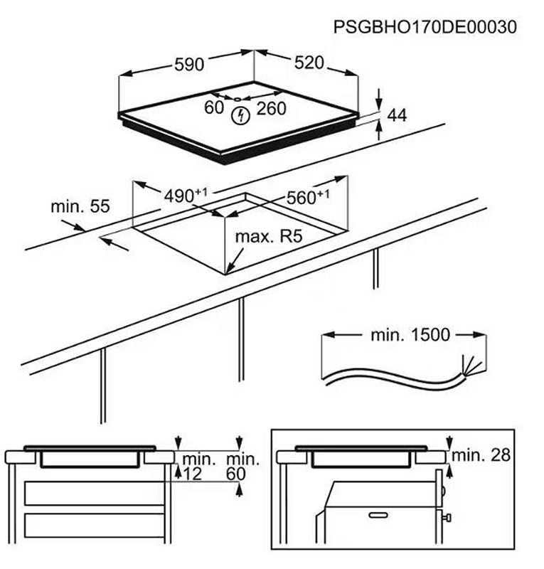 • Размеры: 590 x 520 мм (Ш*Г). Размер ниши для встраивания: 560 x 490 мм. Толщина столешницы: от 44 мм.