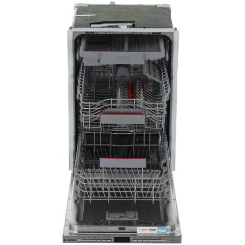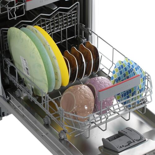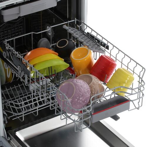 После мытья в посудомоечной машине пластиковая посуда часто остаётся мокрой. Именно для неё в посудомоечных машинах Bosch есть программа ExtraDry. Она повышает температуру последнего полоскания и продлевает время сушки. Таким образом, даже пластиковая посуда, такая как бутылочки для детского питания или посуда для пикника, становится идеально чистой и абсолютно сухой. Вместительный верхний короб можно регулировать по высоте в целом на 5 см между тремя положениями простым движением руки - благодаря системе Rackmatic. Светящаяся точка на полу под посудомоечной машиной будет гореть в течение хода программы и автоматически погаснет после ее завершения.