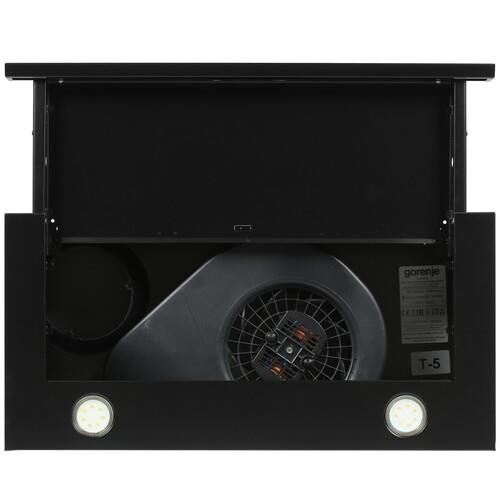Вытяжка телескопическая Gorenje BHP62CLB полностью встраивается в навесной шкаф. Внизу остается на виду только выдвижная панель, за которой с правой стороны расположена панель управления.Прибор способен работать в режиме отвода и циркуляции. Для первого требуется монтаж воздуховода, соединяющего его с вентиляционной шахтой. Для второго – дополнительная установка (и приобретение) угольного фильтра, способного улавливать неприятные запахи и вредные продукты горения.