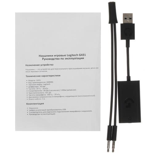 Оголовье с плотной мягкой подкладкой не вызывает ощущения сдавливания на голове. Эргономичные амбушюры с отделкой из экокожи плотно прилегают и помогают максимально погрузиться в игровой процесс. Подключение Logitech G431 к устройствам выполняется по аудиокабелю с разъемами 3.5 мм и переходника с интерфейсом USB.