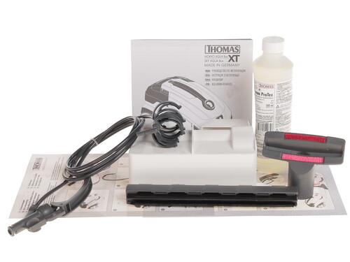 Также устройство оснащается съемным резервуаром для моющей жидкости объемом 1.8 л. Он располагается снаружи пылесоса и легко снимается. Максимальная мощность работы устройства достигает 1600 Вт, однако наличие на корпусе регулятора силы всасывания позволяет снижать как мощность, так и уровень энергопотребления. Помимо этого, в комплекте Thomas MOKKO XT Вы сможете найти насадки как для сухой, так и для влажной уборки, а также специальный моющий концентрат Thomas ProTex.