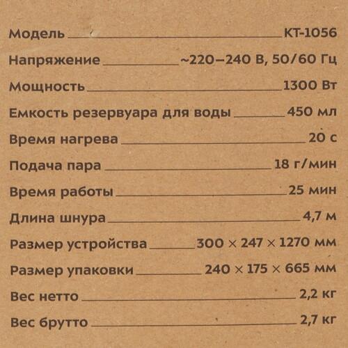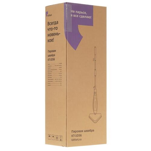Треугольное основание и шаровой шарнир с движением в двух направлениях гарантируют удобную уборку в труднодоступных местах. Несъемный прозрачный резервуар вмещает 0.45 л воды и при полном заполнении обеспечивает до 25 минут непрерывной подачи горячего пара. Для удобного наполнения в комплекте поставляется мерный стакан. Одна из особенностей Kitfort КТ-1056 – сетевой шнур длиной 4.7 м.