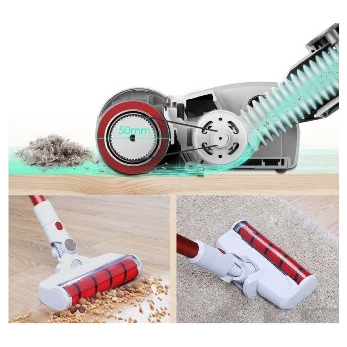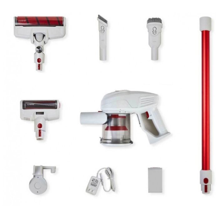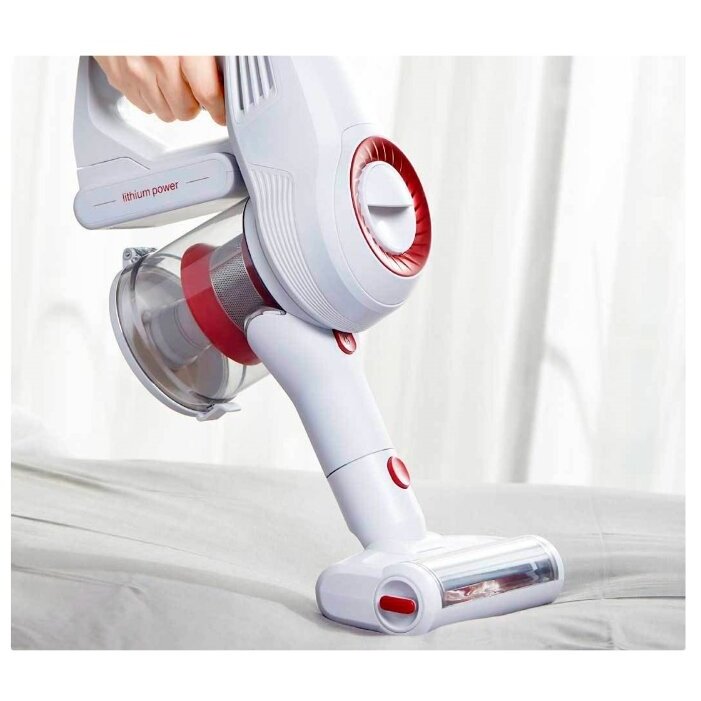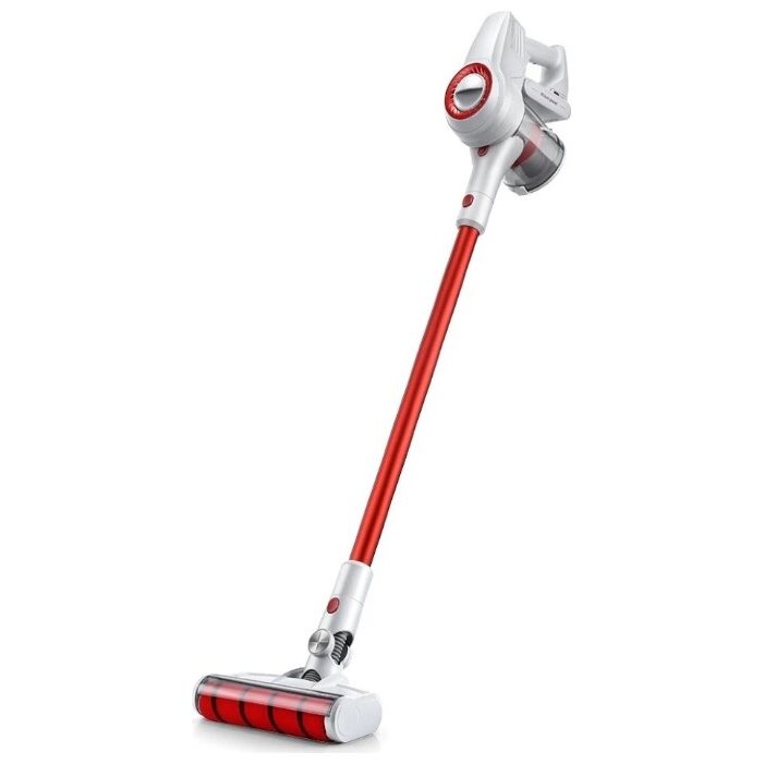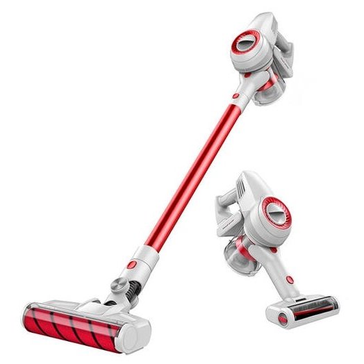 Пылесос изготовлен из металла и пластика. Для удобного перемещения в ручном пылесосе предусмотрены колёсики. Питание осуществляется от аккумуляторных батарей ёмкостью по 2.5 А•ч (всего их 6 штук). В режиме ожидания пылесос может находиться около 360 часов. Кроме того, он поддерживает функцию быстрой зарядки. Вас удивит, насколько тихо работает пылесос Jimmy. Показатель уровня шума составляет около 78 дБ.