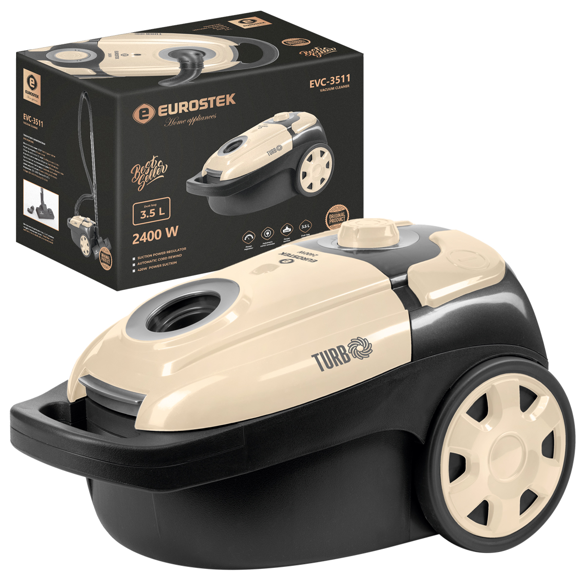 Пылесос с тканевым пылесборником Eurostek EVC-3511, Максимальная мощность 2400 Вт., мощность всасывания 420 Вт., многоступенчатая система фильтрации, телескопическая металлическая трубка и щетка для пола, объем пылесборника 3,5 литра, защита от перегрева, автоматическая смотка шнура, регулировка мощности, насадки в комплекте (щелевая, насадка-щетка)