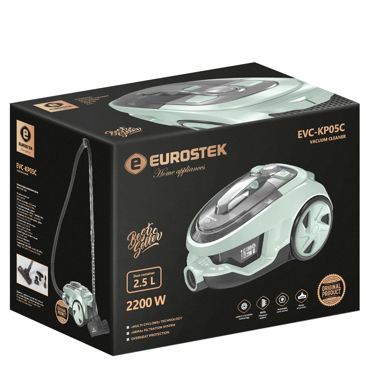 Пылесос с технологией Мульти-циклон Eurostek EVC-KP05С с HEPA фильтром. Максимальная мощность 2200 Вт., мощность всасывания 400 Вт., телескопическая хромированная металлическая трубка, длина шланга – 150 см, щетка для пола, щелевая насадка-щетка и щетка для мягкой мебели в комплекте, объем пылесборника 2,5 литра, индикатор заполнения пылесборника, функция регулировки мощности, фильтрация: внутренний фильтр – губка, внешний фильтр – ХЕПА, защита от перегрева, автоматическая смотка шнура. Длина шнура - 5м