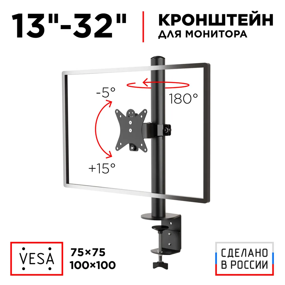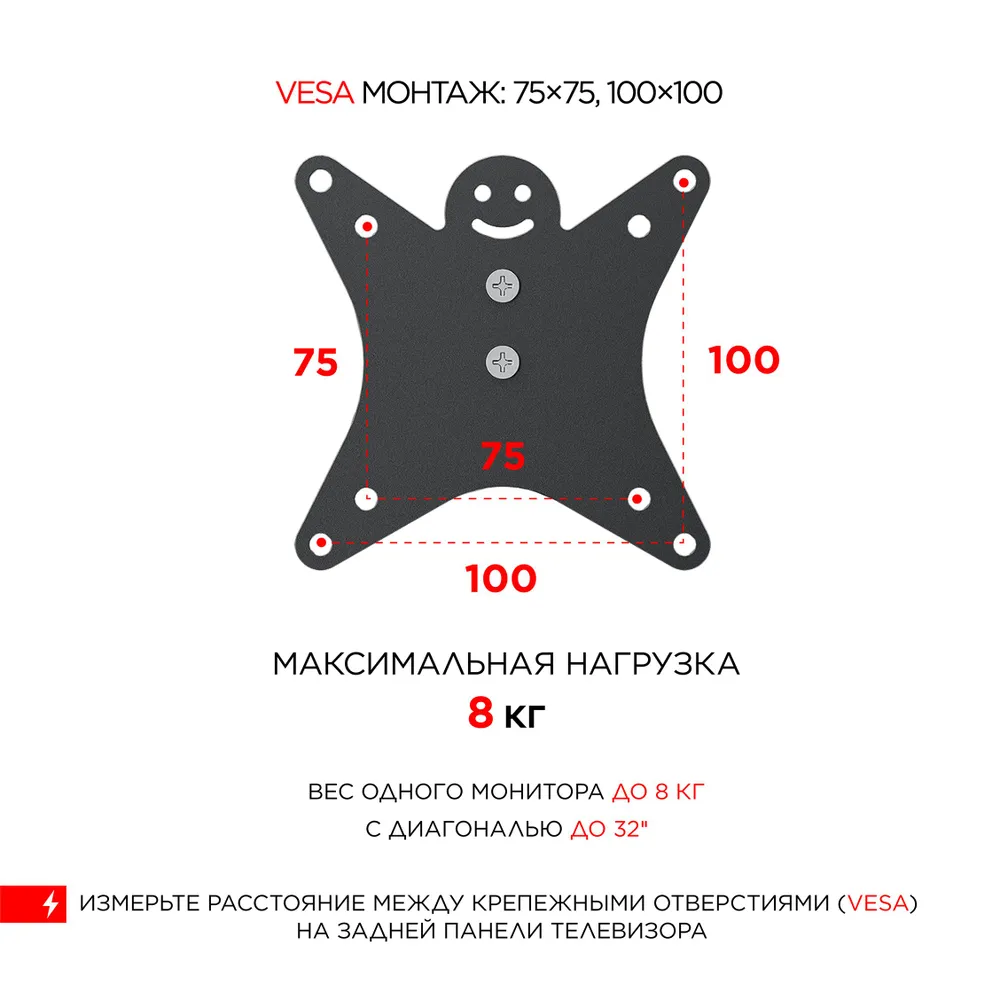 Кронштейн настольный HOLDER MDS-M101 совместим с экранами мониторов диагональю от 13 до 32 дюймов (33-81 см) и стандартами VESA 75х75, 100х100 мм.