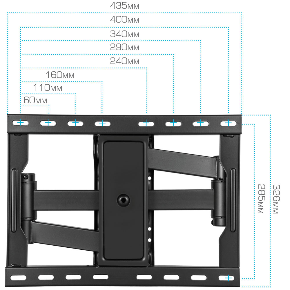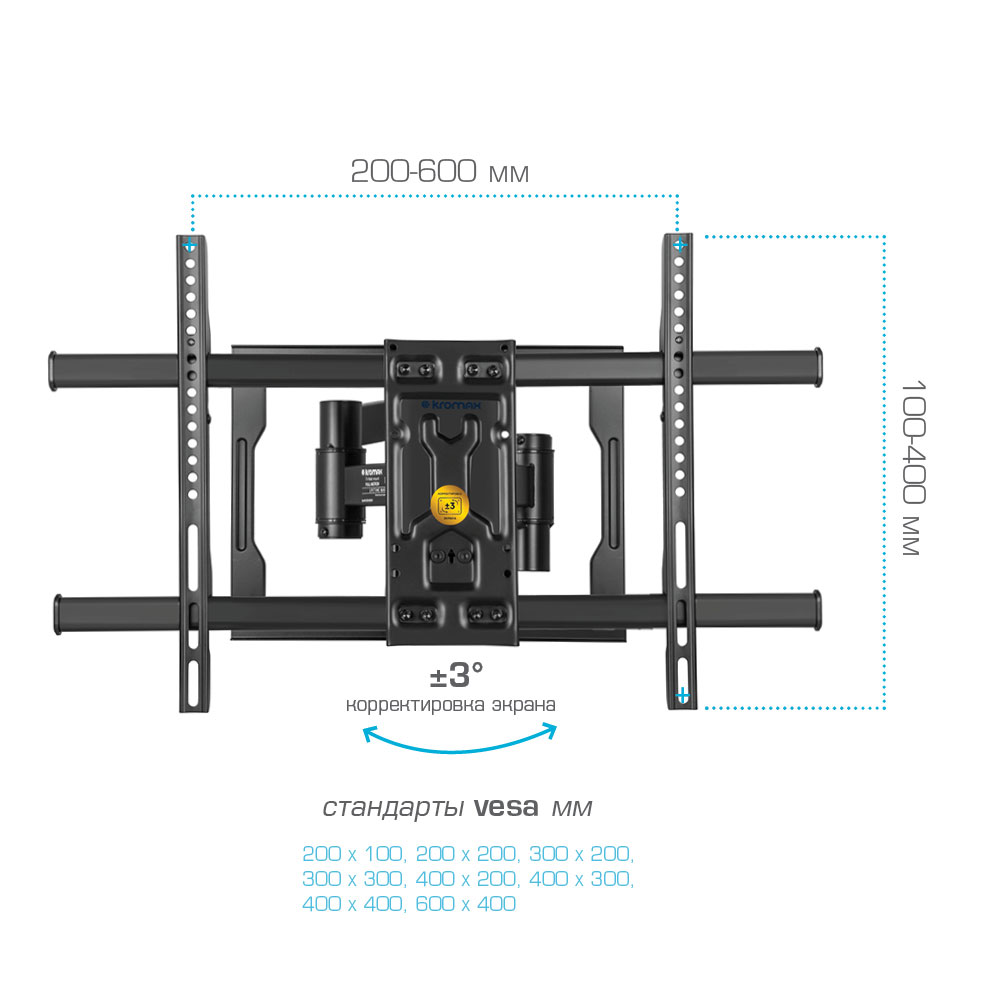 Надежная стальная конструкция максимальная нагрузка до 50 кг, Легкий монтаж при помощи съемной монтажной платформы, Универсальный - телевизор на кронштейне можно наклонить, повернуть и сдвинуть к стене , Корректировка экрана уникальная возможность вращения экрана на ±3° относительно стены