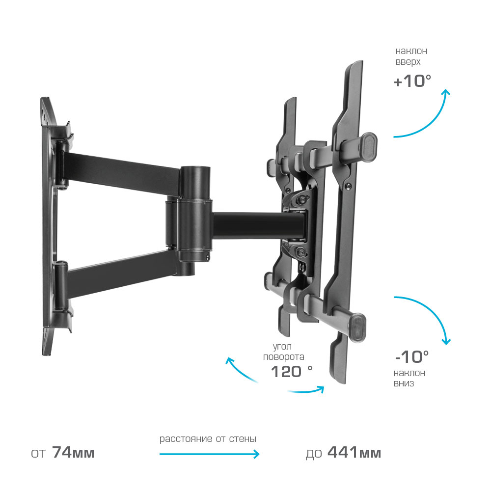 KROMAX ATLANTIS-85 BLACK надёжно удержит экран размером 32"-70" дюйма и весом 50 кг. Простая конструкция KROMAX ATLANTIS-85 BLACK идеально подойдет для самостоятельного монтажа. Наклонно-поворотная регулировка позволит наклонять вверх и вниз на ±10°, поворачивать влево и вправо на 120°, и выдвигать на 74-441 мм.