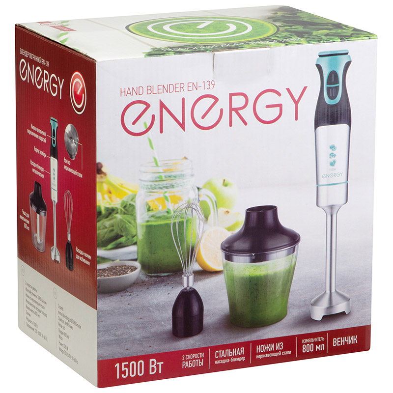 Погружной блендер ENERGY en-139, 1500 Вт, 2 скорости, измельчитель, венчик 105259 предназначен для измельчения продуктов, приготовления коктейлей и пюре.