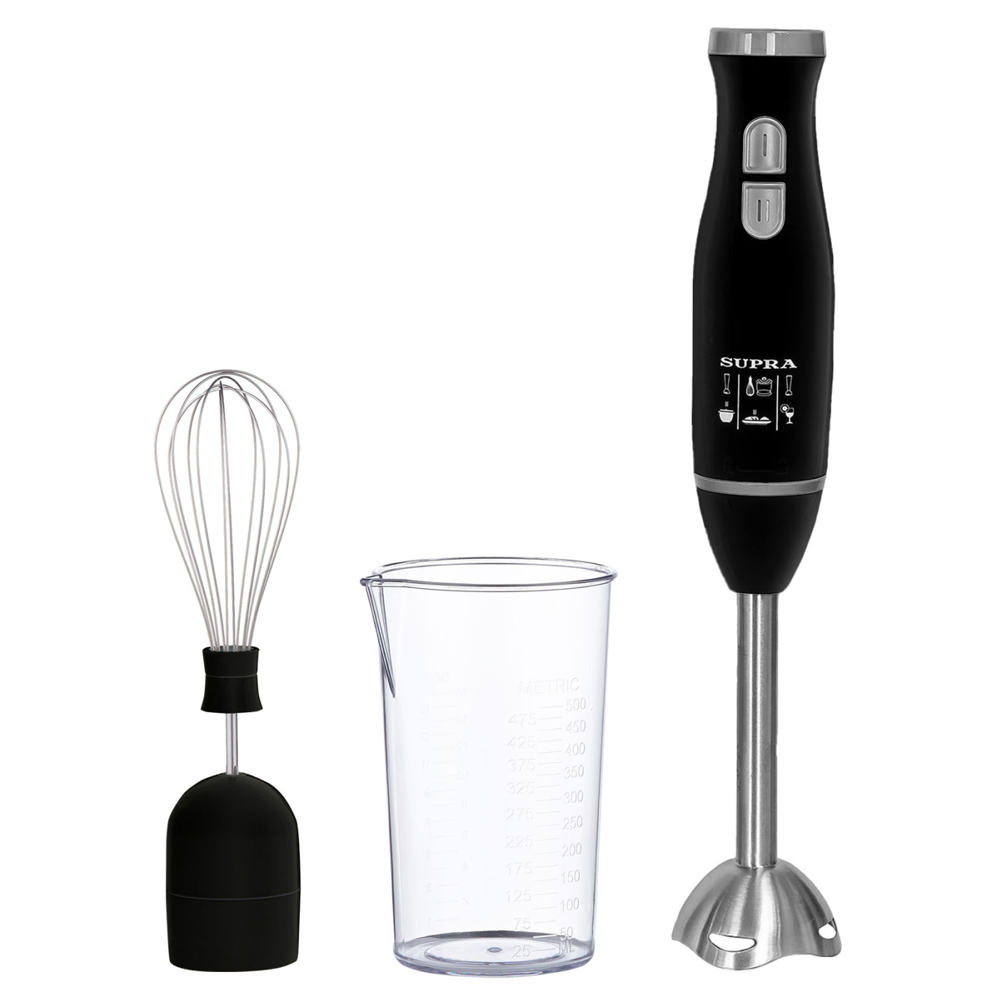 Комплектация блендер, съемная насадка-венчик из нержавеющей стали, мерный стакан 500 мл., гарантийный талон, инструкция на русском языке