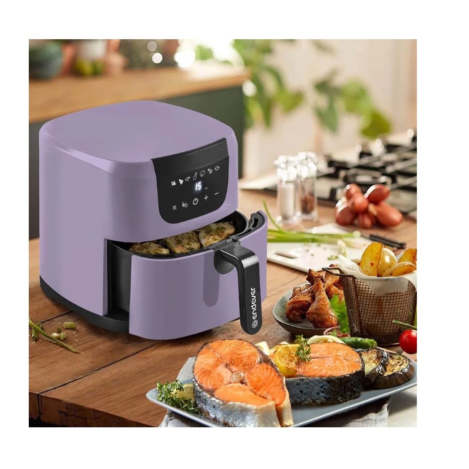 Аэрогриль оснащен сенсорным управлением и имеет 7 автоматических программ, благодаря которым вы можете приготовить картофель фри, пиццу, куриные крылышки, куриные ножки, стейки, креветки и рыбу. А также при желании, Вы можете вручную изменить время и температуру приготовления, что делает устройство еще более удобным в использовании.Мощность аэрогриля 1800 Вт и контейнер с антипригарным покрытием, объемом 4, 5 литра, позволяет приготовить необходимое количество блюда быстро и легко. Продукты помещаются на специальную съемную решетку, которая также имеет антипригарное покрытие.