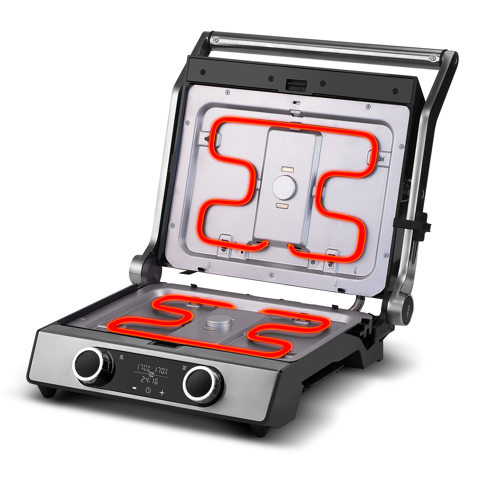 Гриль можно полностью раскрыть на 180°, что удобно для приготовления на большой поверхности, а регулируемая крышка адаптируется к толщине продуктов, обеспечивая равномерное прожаривание.