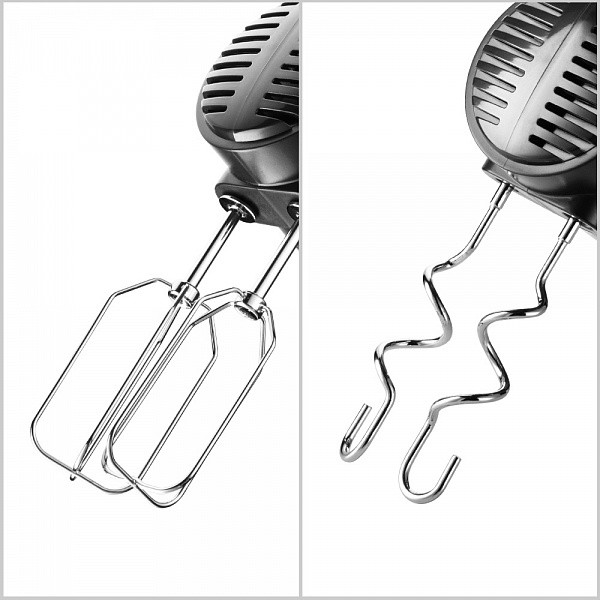 ручной миксер, мощность 600 Вт, крючки для замешивания теста, венчик для взбивания, кнопка отсоединения насадок