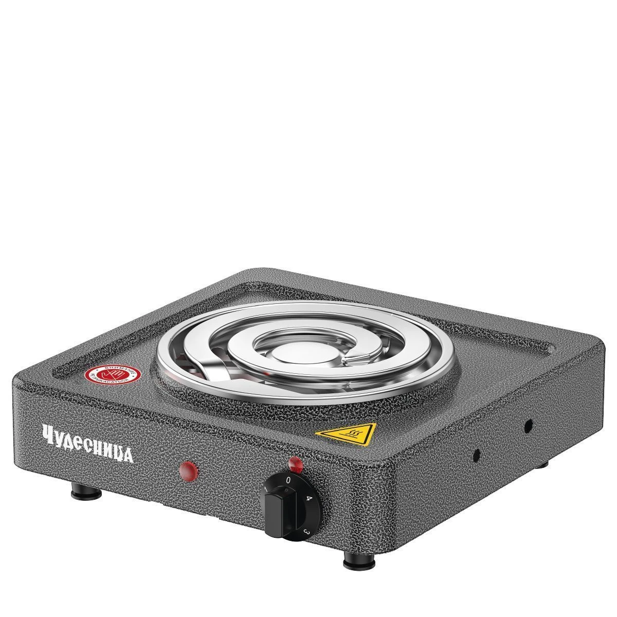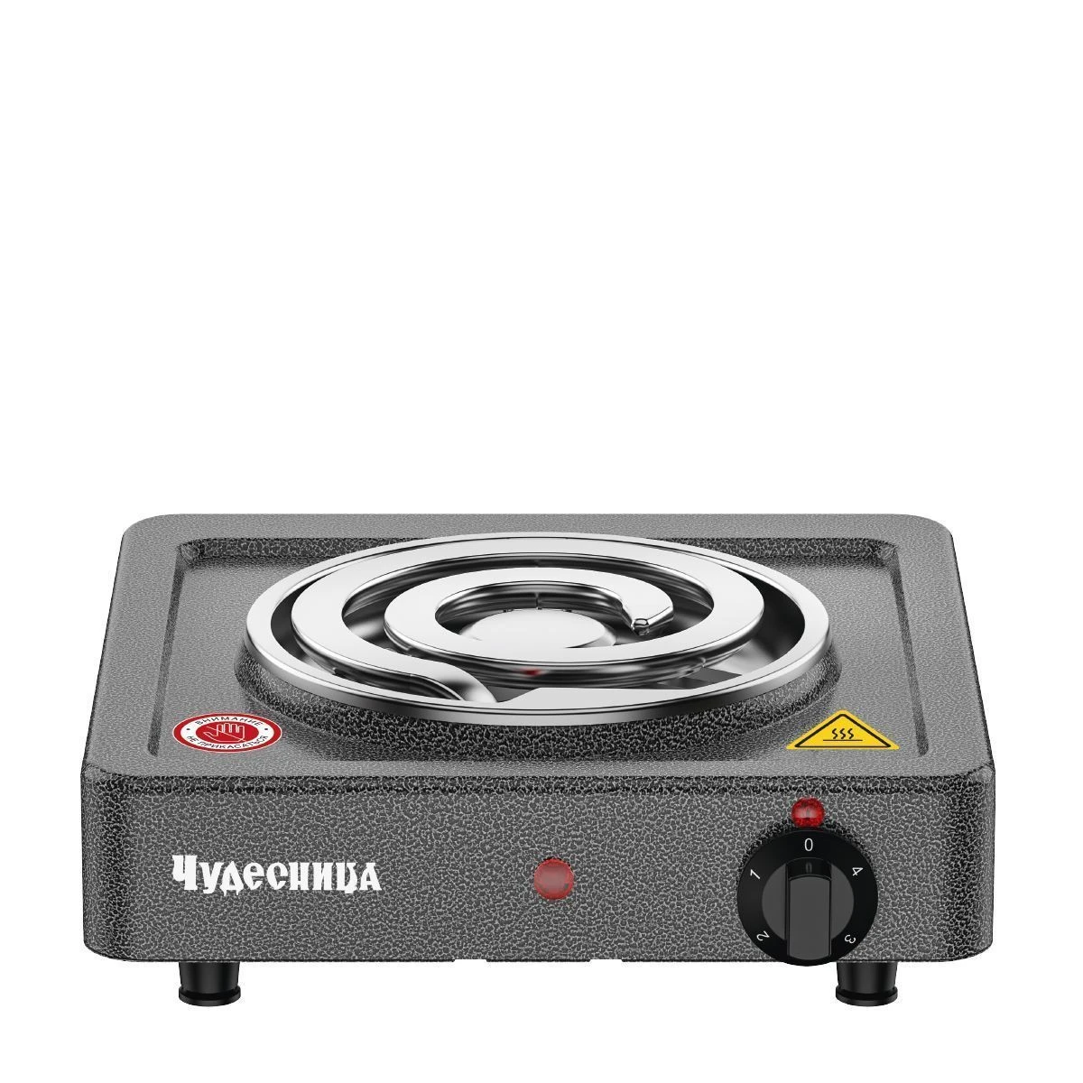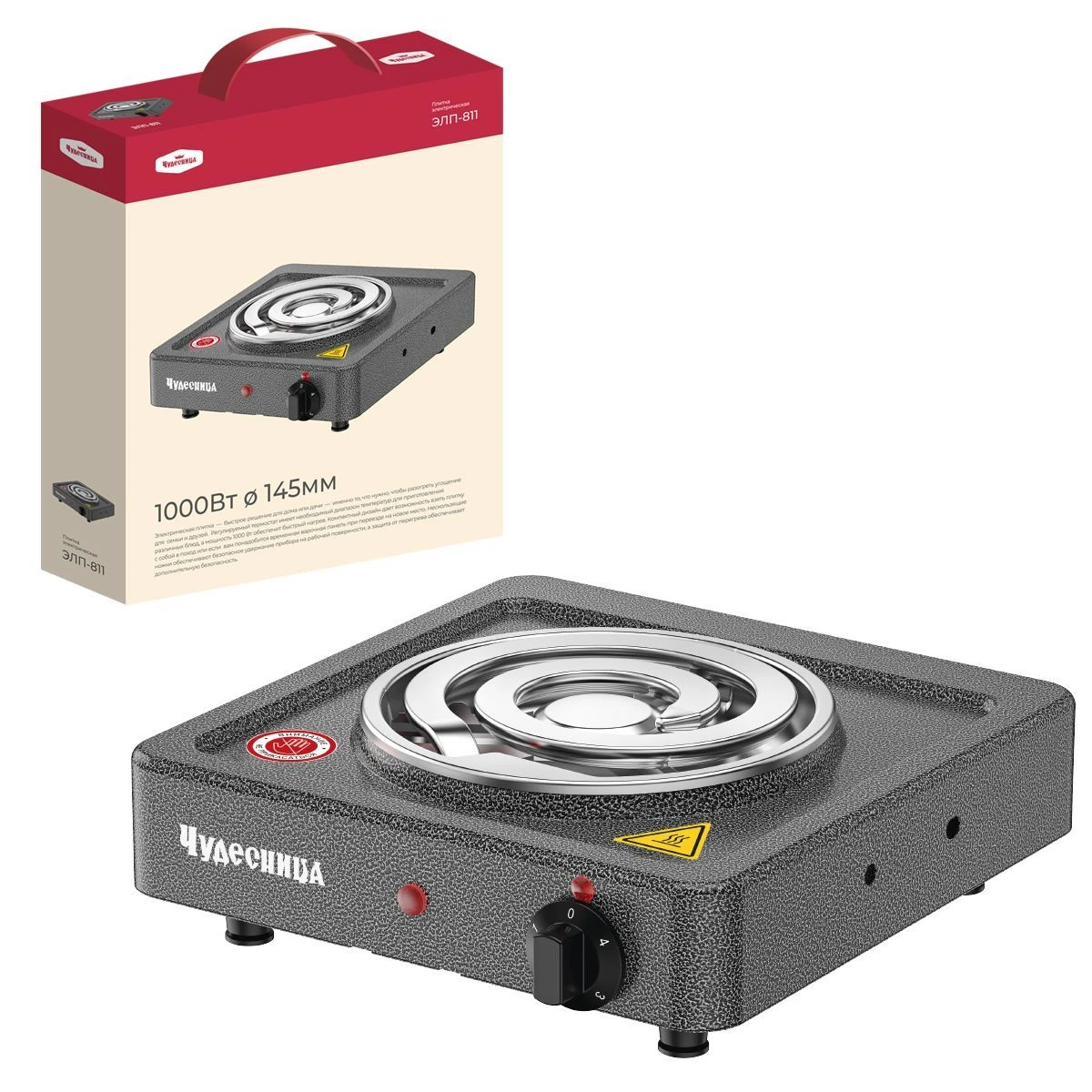 Плитка электрическая Чудесница ЭЛП-811 с 1-й конфоркой, цвет черный, мощность 1000 Вт, толстый спиральный нагревательный элемент из высококачественной стали, регулировка температуры, прочное легкоочищаемое термостойкое эмалевое покрытие, защита от перегрева, световой индикатор работы